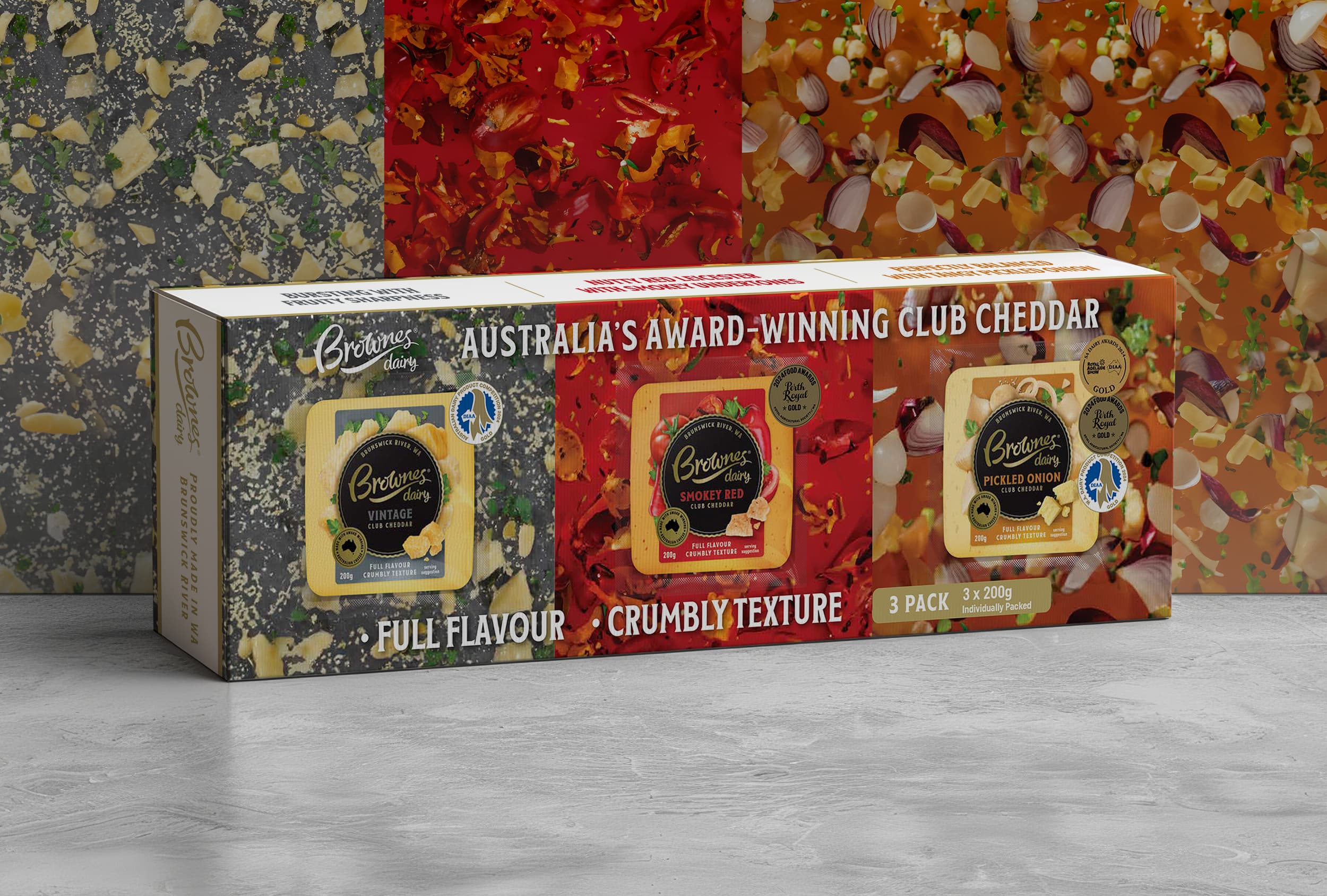 The design uses a vibrant, layered approach to reflect the product’s Full flavour and Crumbly texture. By combining bold graphics with clean typography, the identity ensures consistent visual quality across large-scale exhibitions and retail packaging.