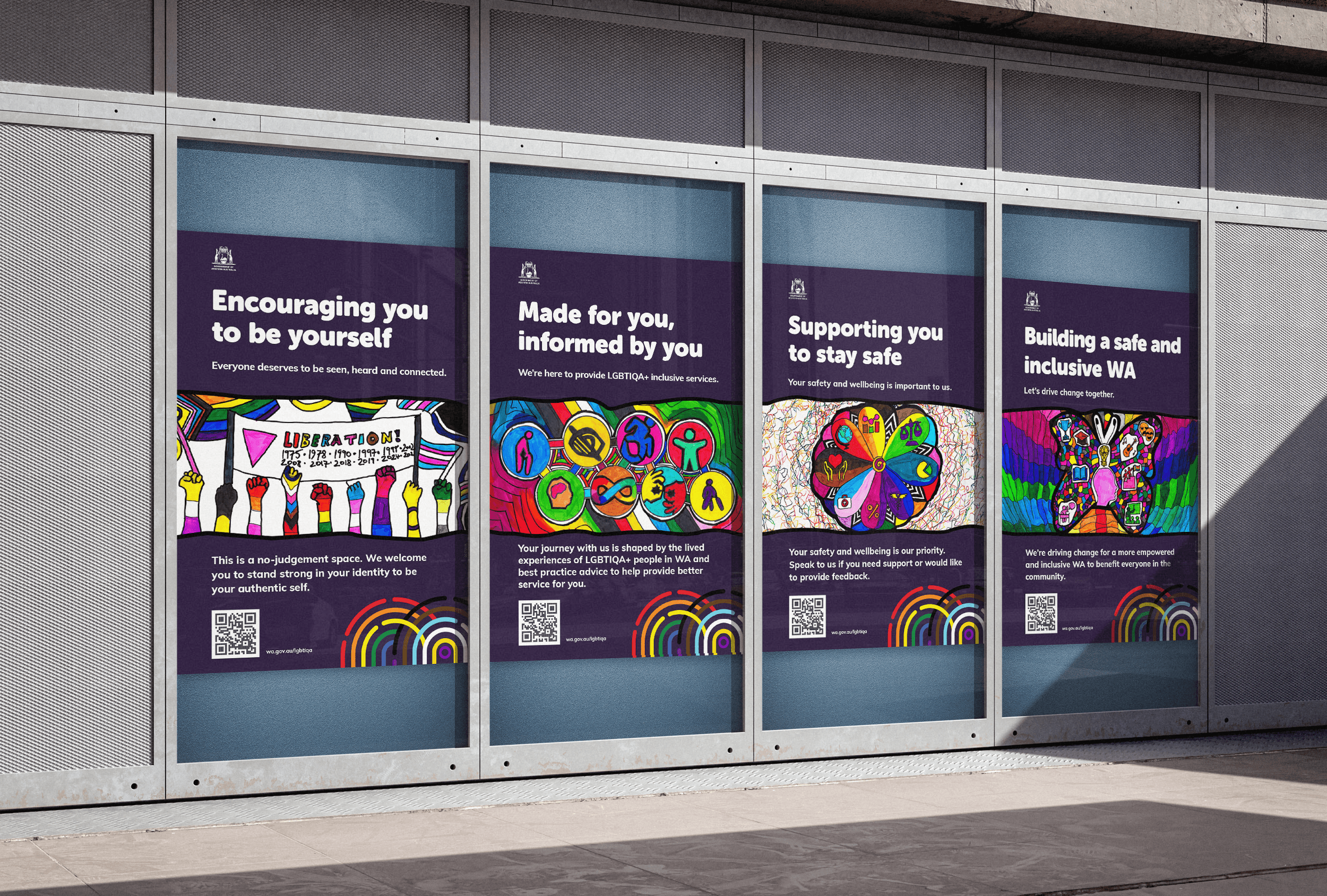 The design concept uses a vibrant, layered visual language to represent the diverse intersections of the LGBTIQA+ community while maintaining a structured, professional government standard. By balancing bold inclusive imagery with clean typography, the identity creates an accessible and safe space for sharing stories of systemic change.
